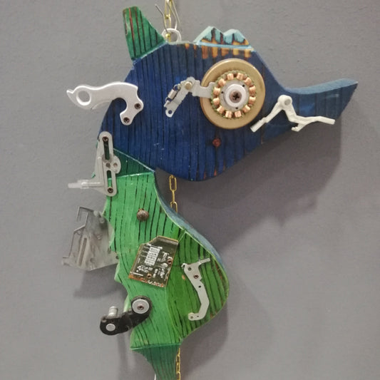 Artestò, Cavalluccio Marino Catena testa blu, legno e pezzi meccanici di scarto, 40x25x5 cm