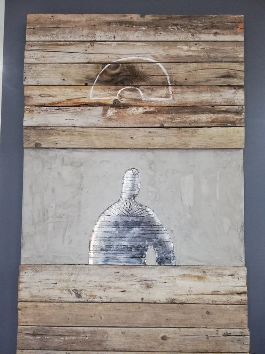 Paolo Fiorellini, quadro "Latta, legno e Cemento", Ecce Homo, alluminio, cemento e legno, 100x170
