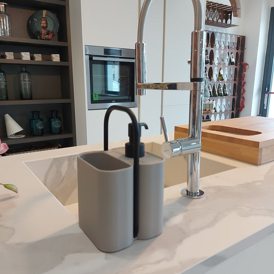 Geelli, contenitore/dispenser PLY SOAP in Gel colore sabbia con manico nero, 11,5 x 11,5 x h 20 cm, Monica Graffeo, GPL-SAP-C21-C06