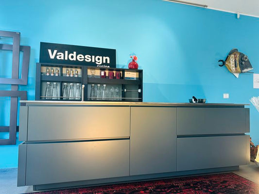 Valdesign, cucina Logica L90 con isola Prosecco con top Laminam Noir Desire