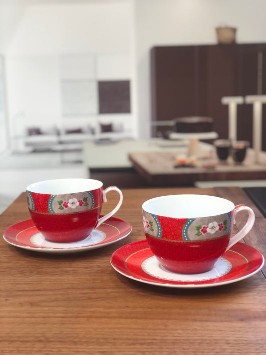 Pip Studio, set 2 tazze con piattino per capuccino/tè Blushing Birds rosse, h7,5 x d16,5, porcellana