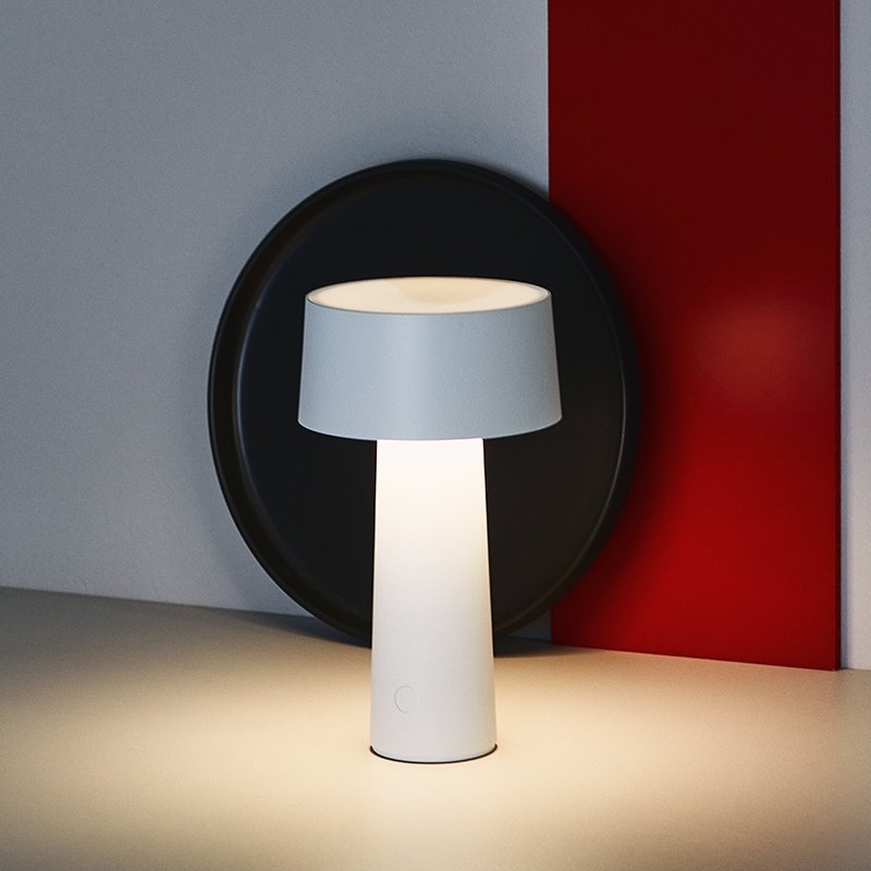 A nomadic light, an object that takes up the theme of the 'technological' candle, a small rechargeable lamp to place on a table, on a nightstand, or on the floor at the edge of a room, capable of creating a soft and welcoming light. Mush is a simple, rigorous, and minimal object, characterized by pure geometries and a diffusion of light that spreads over the lower part of the lamp and its surface.