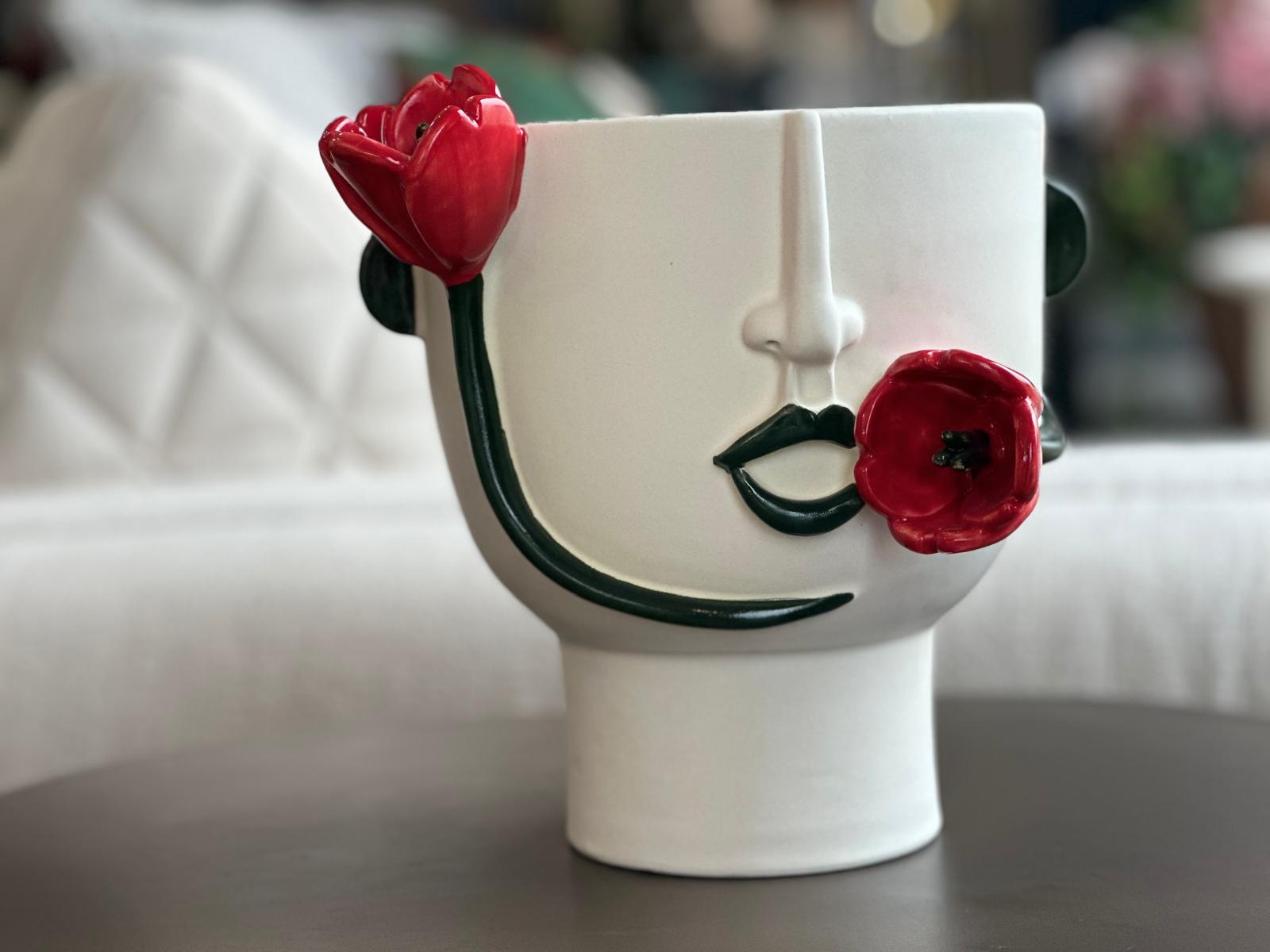 Questo sofisticato vaso in ceramica smaltata bianca sfoggia un aspetto singolarmente accattivante, ispirato all'affascinante donna che si dice difenda questo meraviglioso tulipano della città siciliana di Blufi. I tulipani rossi in fiore, resi in modo squisito e finemente dipinti a mano, avvolgono con grazia la silhouette antropomorfa del vaso, catturando una squisita sintesi di artigianato e natura.